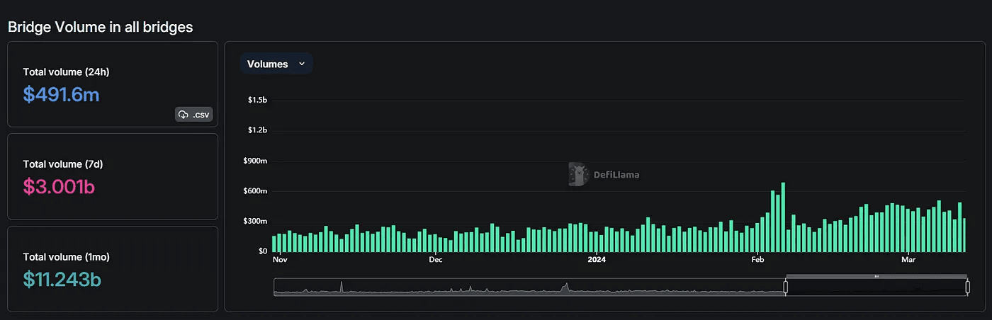 Bridge volume has more than doubled since November 2023. Source: DeFiLlama