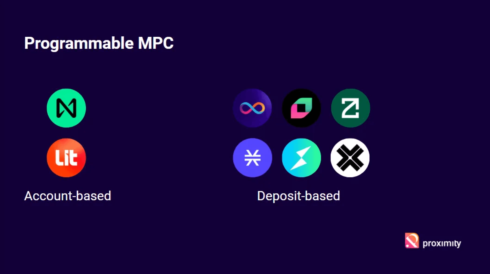 Today, there are mainly two approaches to programmable MPCs. One is deposit-based and the other account-based. Deposit-based MPC networks maintain deposit addresses to create a canonical bridged asset. This is the case of Dfinity $ETH or Zetachain $BTC; Thorchain, where users deposit to a specific address to enact swaps with another user; or Axelar, where, as a generalized bridge protocol, it maintains the deposit address for the user without the user having direct access to it.