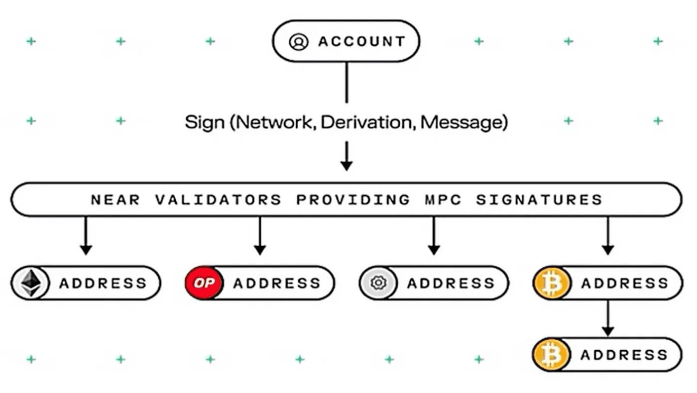 An account on NEAR, which can also be a smart contract, requests validators (i.e. MPC nodes) to sign an arbitrary payload (e.g. a transaction on Bitcoin or Optimism)