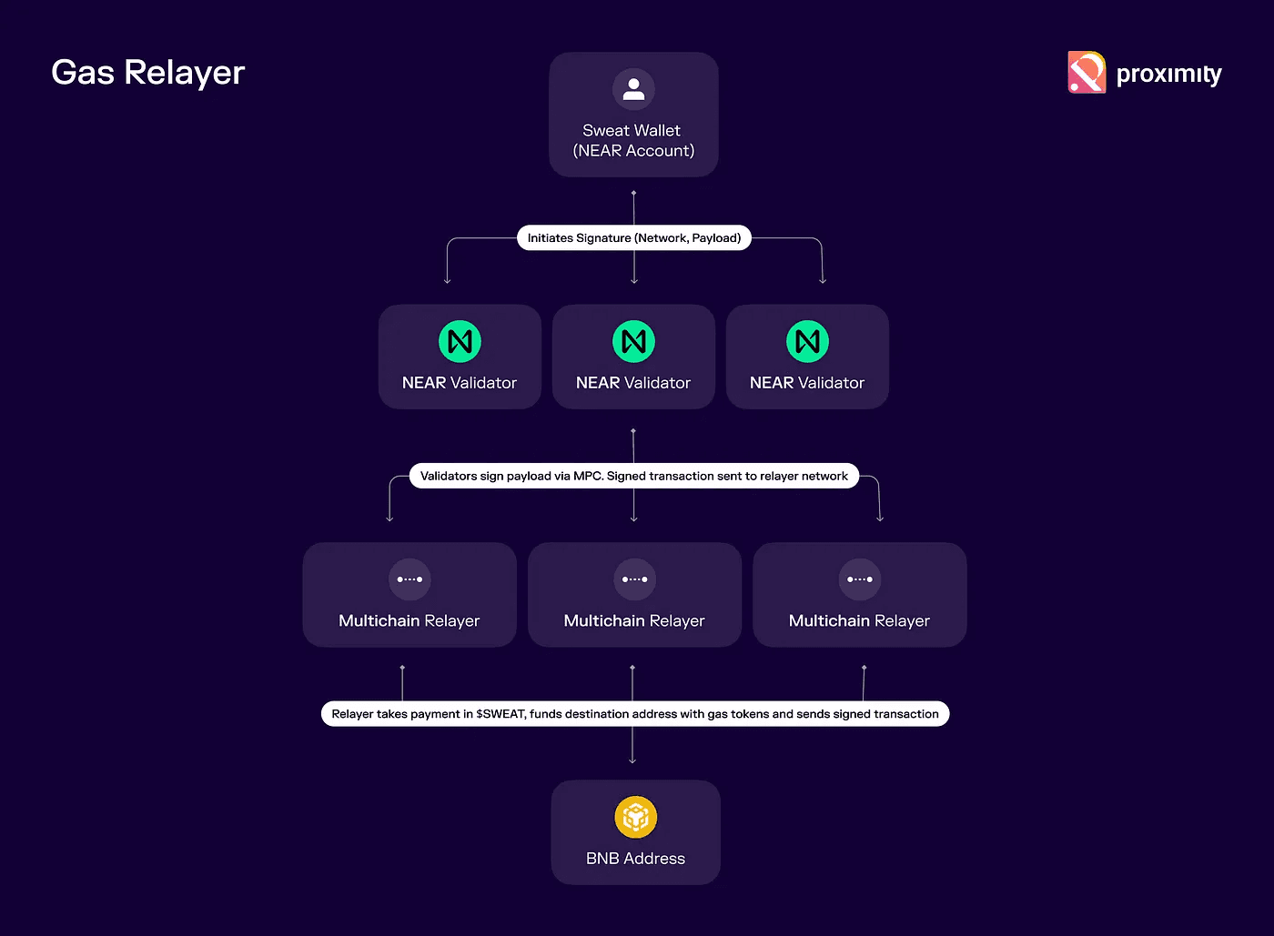 The gas relayer picks up the transaction; the user pays for gas in $SWEAT on the NEAR network.